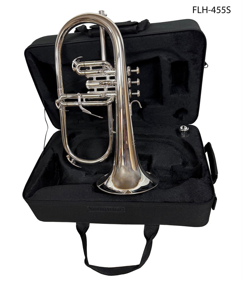 Флюгельгорн "Bb" BRAHNER FLH-455S (Пр-во КНР) СЕРЕБРЕННОЕ покрытие, помповый, с механизмом для подстройки на третьем кроне, сливной клапан на 1-м, 3-м и центральном кронах, мундштук, кейс с лямками рюкзачного типа, наружний карман для нот.