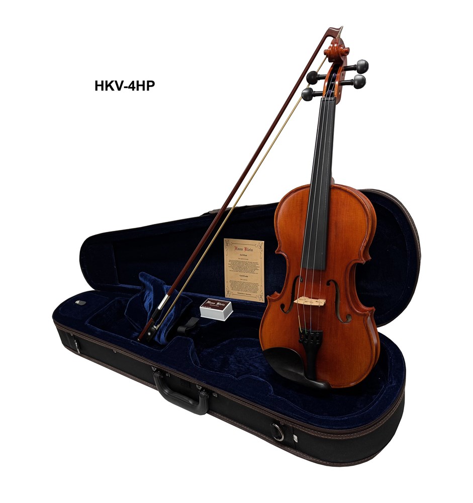 Скрипка HANS KLEIN HKV-4 HP (Германия) Комплект - КЕЙС + СМЫЧОК + КАНИФОЛЬ, верхняя дека - резонансная германская ель, нижняя дека и обечайки - клён, фурнитура - чёрное дерево (EBONY), струнодержатель с 4-мя машинками микроподстройки, покрытие - матовый лак