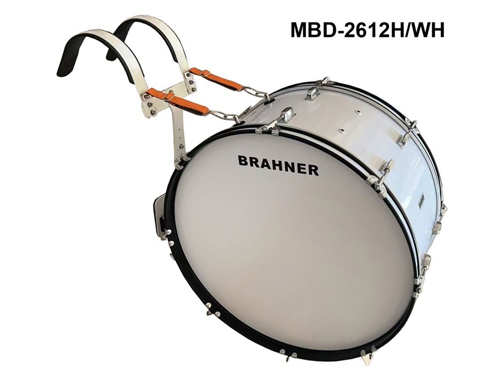 БАС-барабан (маршевый) BRAHNER MBD-2612H/WH (Пр-во КНР) размер 26"x12", цвет - БЕЛЫЙ, наплечный держатель, обручи: 1.5мм (сталь), черные; фурнитура -хром - 8шт. Материал: 7-ми слойная фанера (американская липа), отделка - пластик, 2 колотушки в комплекте
