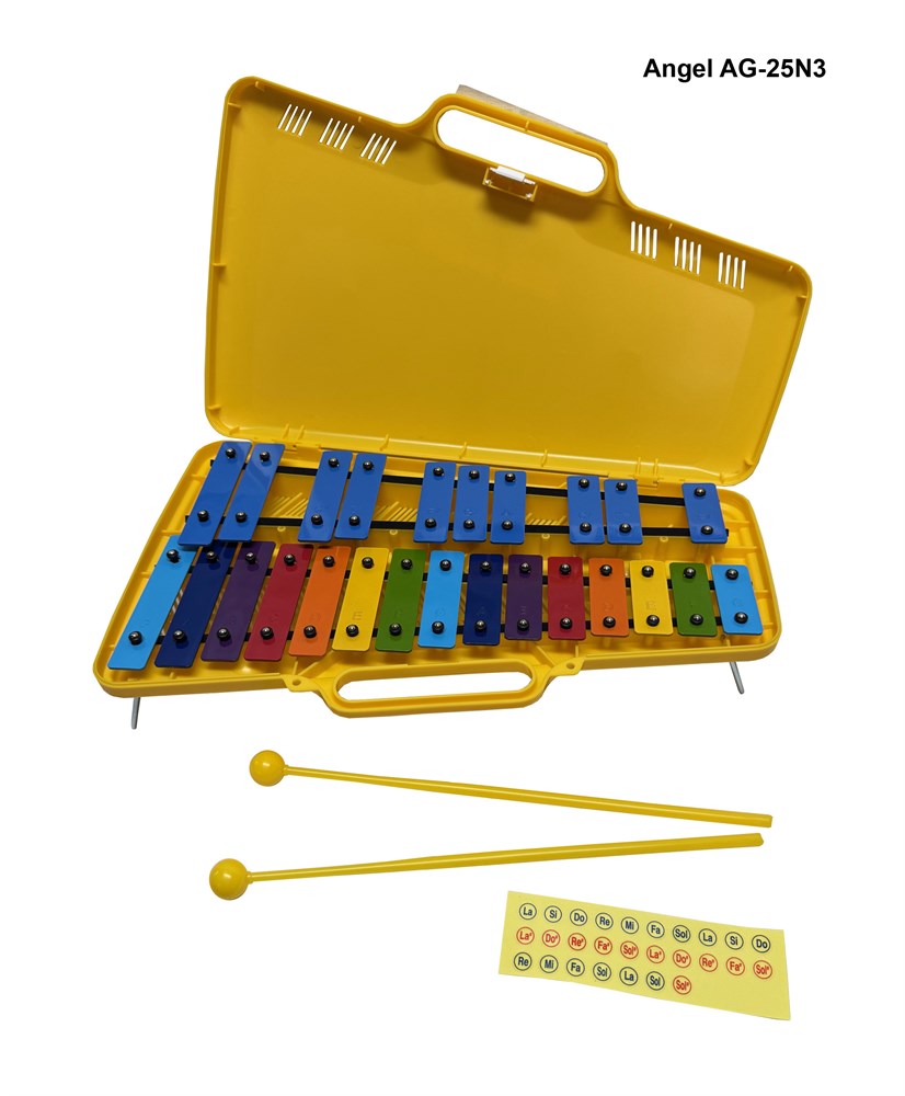 Металлофон/Глокеншпиль Angel AG-25N3 (Пр-во Корея) хроматический, 25 нот, диапазон G4-G6. Разноцветные металлические пластины. Пара палочек в комплекте. Пластиковый футляр, цвет жёлтый,